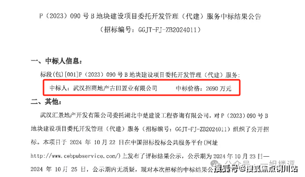 早在去年10月份,该项目就发布P(2023)090号B地块建设项目委托开发管理(代建)服务中标结果公告,显示结果就是招商代建。