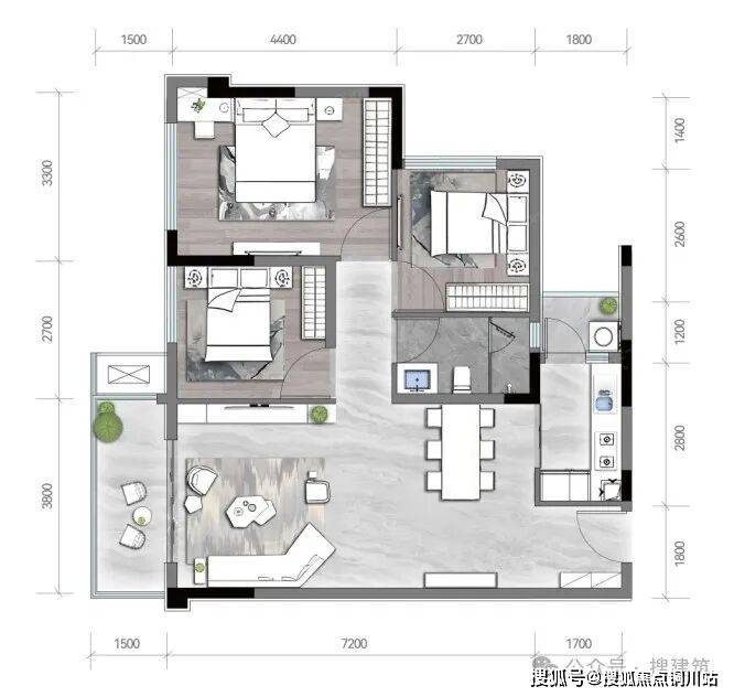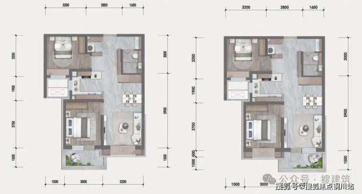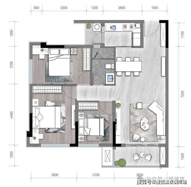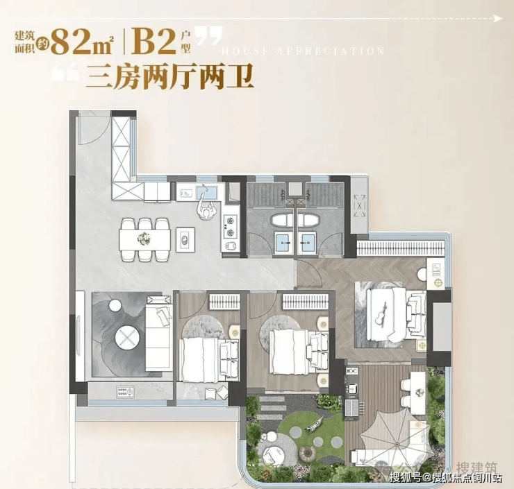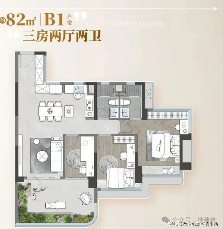 建面约85㎡产品,三室两厅一卫,双阳台设计,一方是生活、一方是风景。
