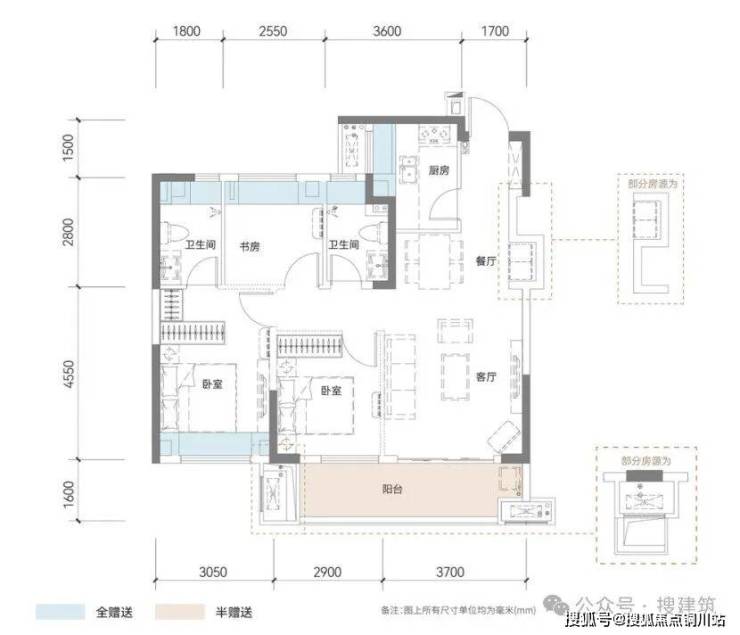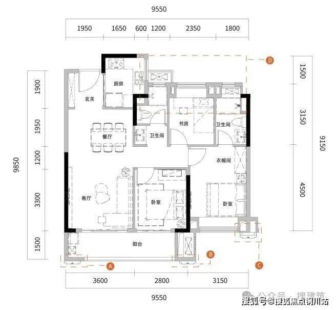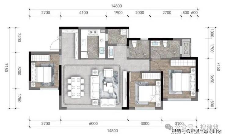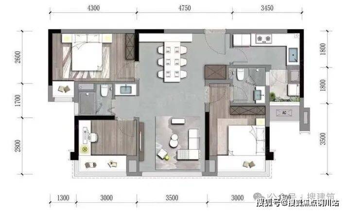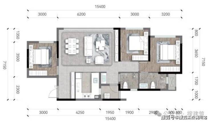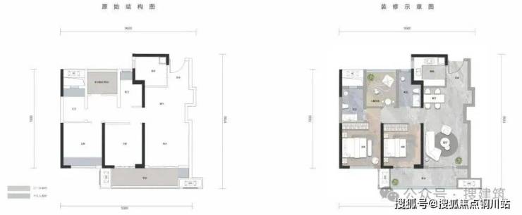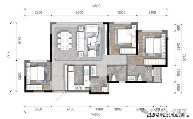建面约95㎡产品,三房两厅两卫,实际得房率高达约95%。三开间朝南,动静分区明确。