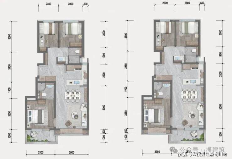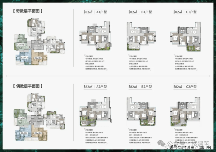 两个户型唯一不同在于,偶数层户型主卧套房连接空中花园,奇数层户型是南向次卧连接空中花园。