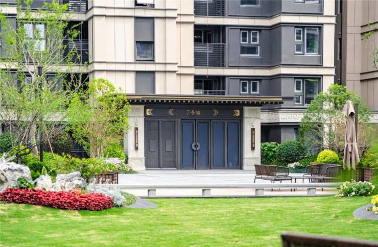 不像传统的单元门设计,观云府通过飞檐翘角搭配卡麦色石材回纹雕刻,金属线条与椽子的碰撞间,将传统礼制的庄重与现代审美的利落相融合,并且单元门两侧的景观也是定制的,入户红枫、四季桂等乔木、灌木精致搭配,归家仪式感十足。