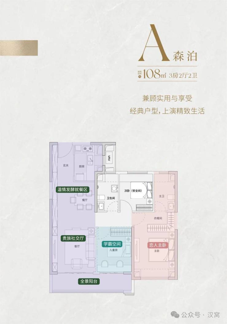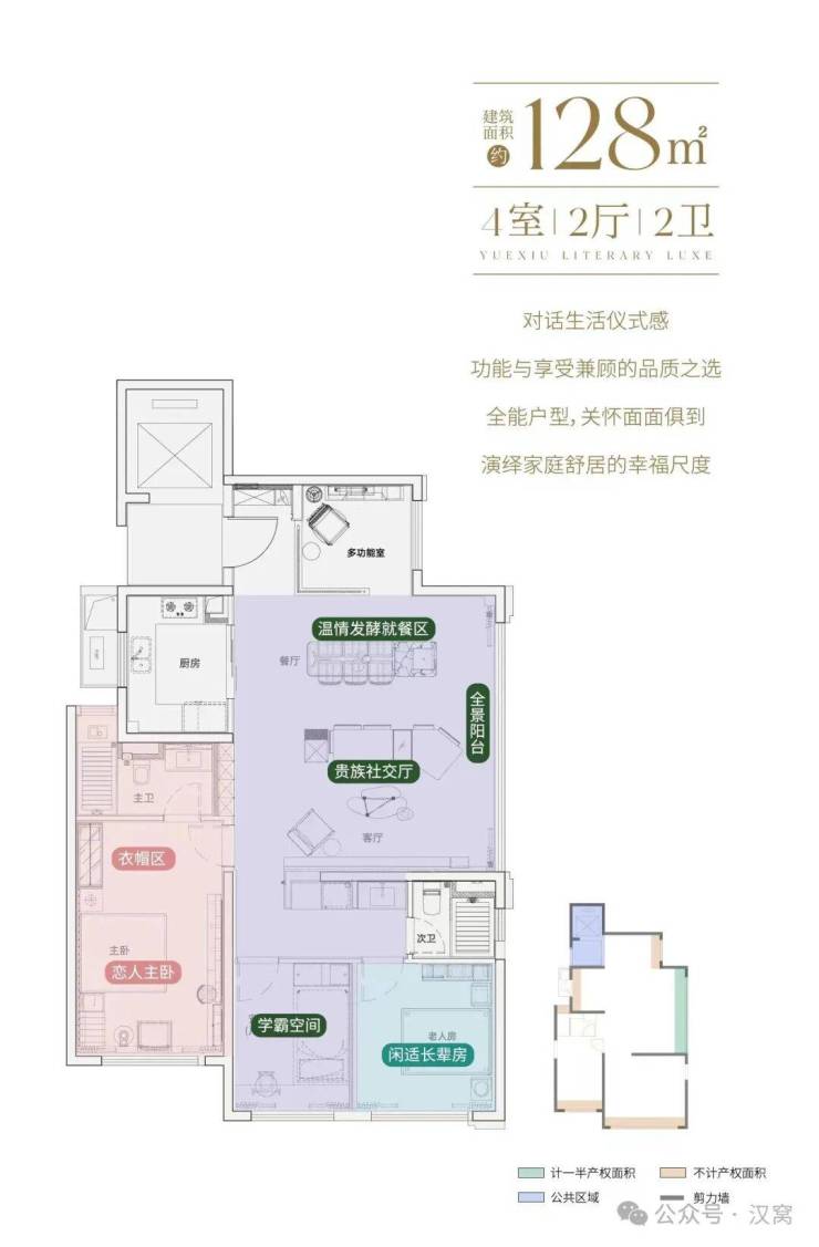 主卧特别设计了睡前交流区,还有独立书房可用作亲子空间;阳台面向小区园林,视野很棒,但是和108㎡户型共用电梯,隐私性会打点折扣