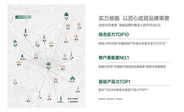 30载绿城,拓耕200余城,营造1000余座美丽家园,超5300亿元总资产规模,超1000亿元净资产规模,1188亿元品牌价值,著下经典无数。(截至2024年12月)