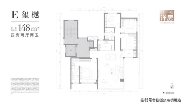 洋房建面约148㎡四房,我第一眼就被约35㎡的端厅吸引到了,端厅南向和东向都可以看到楼下的风景,视野很敞亮。西侧主卧的起居室、洗手间均位于南面,采光很好,东侧的次卧还自带生活阳台。