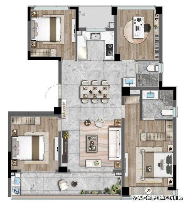 139㎡的四叶草布局,南向约7.9米的大阳台,主卧空间达22㎡,既保证了空间私密性,又较大限度地减少过道空间的浪费。