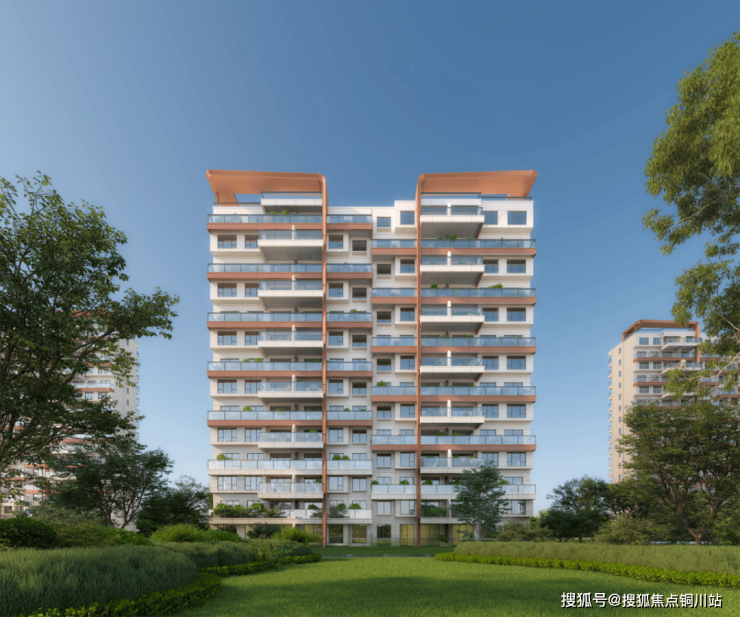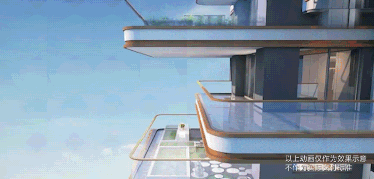 另外,标志性香槟色铝板线条勾勒出极具标志性屋檐设计,“展翅飞翔”造型挑檐给予归家尊崇体验。搭配大玻璃栏板,增强空间的通透感和自然采光,视觉非常震撼!