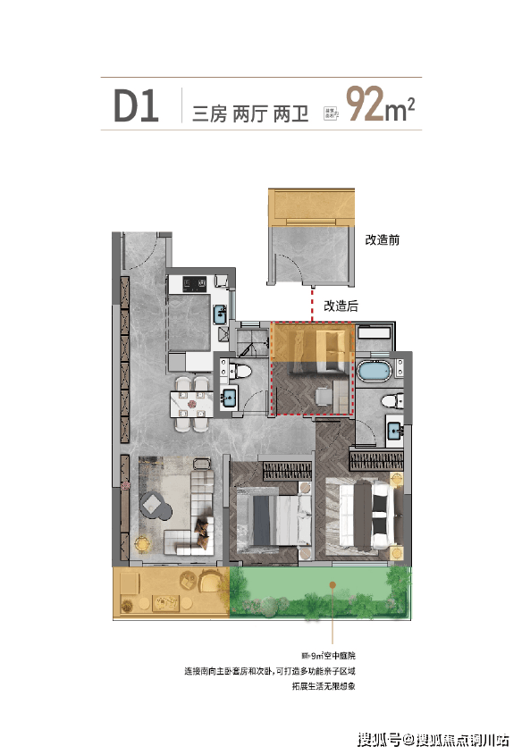 户型非常方正,三开间朝南,动静互不干扰。LDKG一体化的设计,让家庭聚会社交自在从容。南向面宽约9.45米,生活阳台连接客厅,约9㎡的空中庭院连接主卧套房和次卧,拓展生活无限想象。