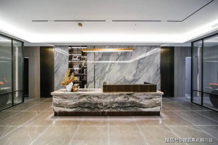 步入大堂园区内,接待前台的石材质感温润典雅,与蓝金沙岩板的接待区背景相得益彰。