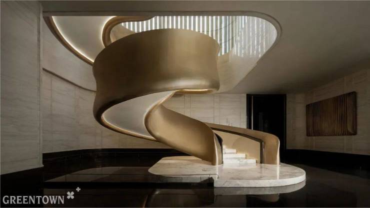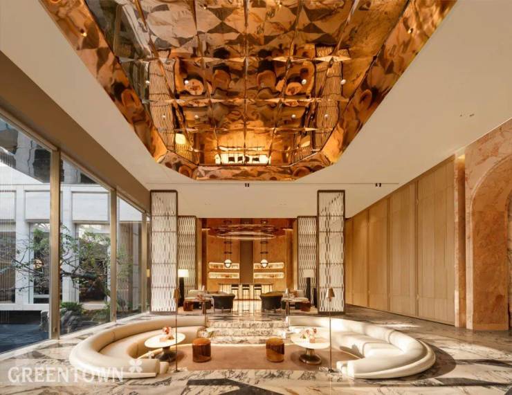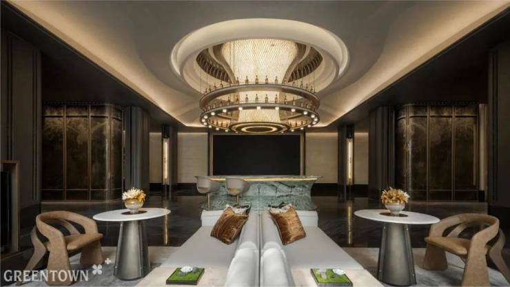 步入生活美学馆,以艺术大堂开启视觉盛宴。 “弧形”元素贯穿室内空间,光影交错间尽显韵律与和谐。金属编织屏风,手工质感与山水光影并存。曲面造型的玉石接待台,彰显现代精致与东方优雅。墙面铺陈墨染流云大理石,引领美的探索之旅。艺术楼梯贯穿各层,金属漆扶手与奢石地面交相辉映。水吧区,绿色奢石圆形吧台居中,与金属吊顶共同营造温润内敛氛围,让心灵在交谈品茗中放松。