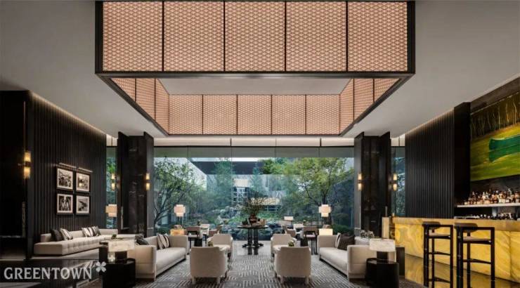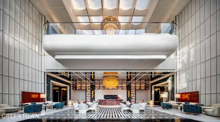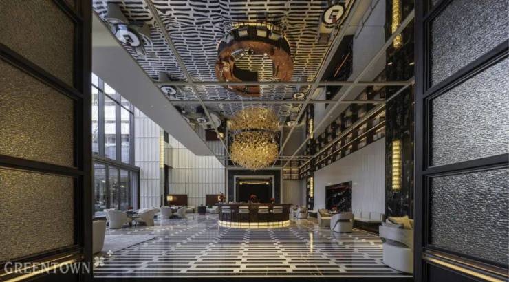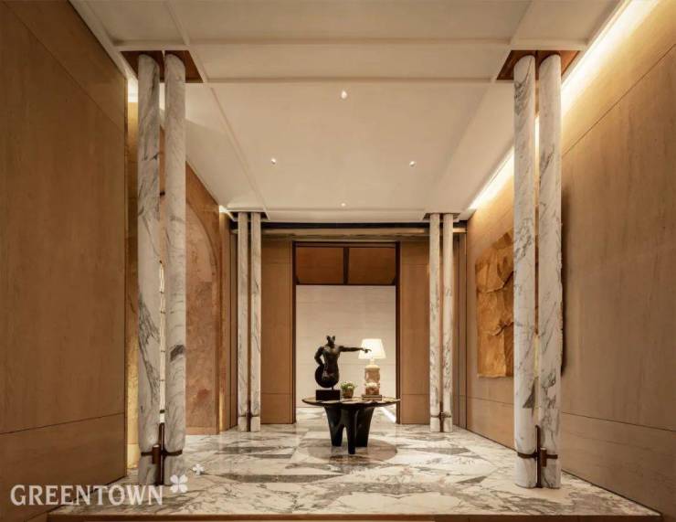 杭州咏湖云庐落址于白马湖畔,生活美学馆室内设计“以水为形,以马为意”,将杭州湖滨文化与现代艺术完美结合,呈现高奢度假酒店的自在与松弛。胭粉色大理石拱门、几何造型天花板、温润木质墙面,搭配纹理华美的大理石,在材质与造型的碰撞中彰显质感,勾勒出水的灵动韵律。白马雕塑、马主题油画作品等元素贯穿始终,以 “马” 为意,将人文底蕴融入空间。