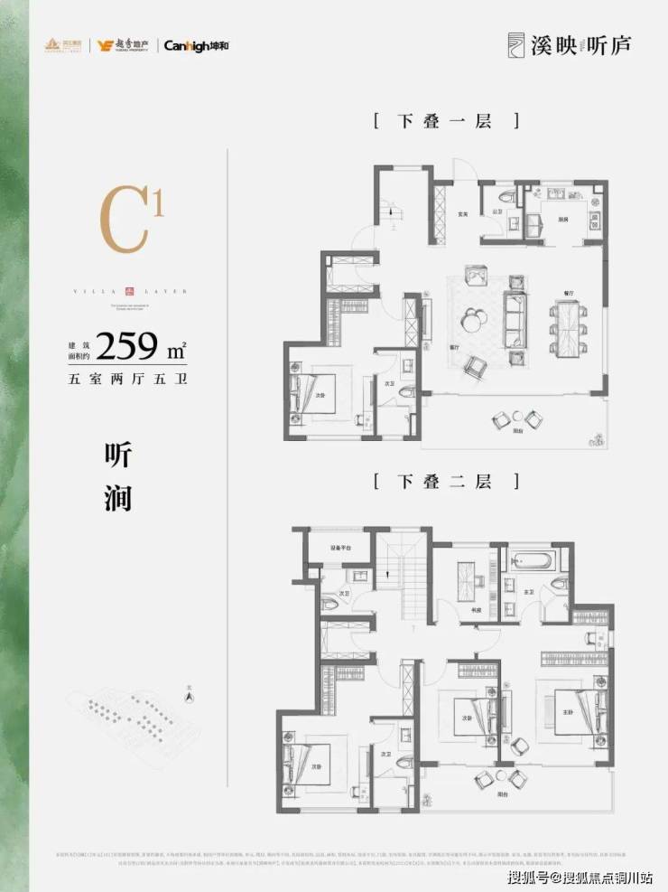 259方边套下叠,二楼为四房含双套房设计,主卧套房面积约32方,外接约7.55米的跑道式阳台;一楼也是做了角厅设计,超宽舒的客餐厅,约7.55米×6.1米,采光和视野非常通透敞亮。
