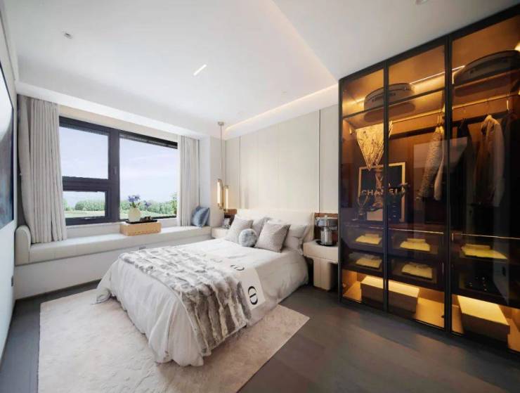 主卧套房设计,自带壁挂式智能马桶、艾芬达电热毛巾架、嵌入式顶喷花洒、美妆冰箱。