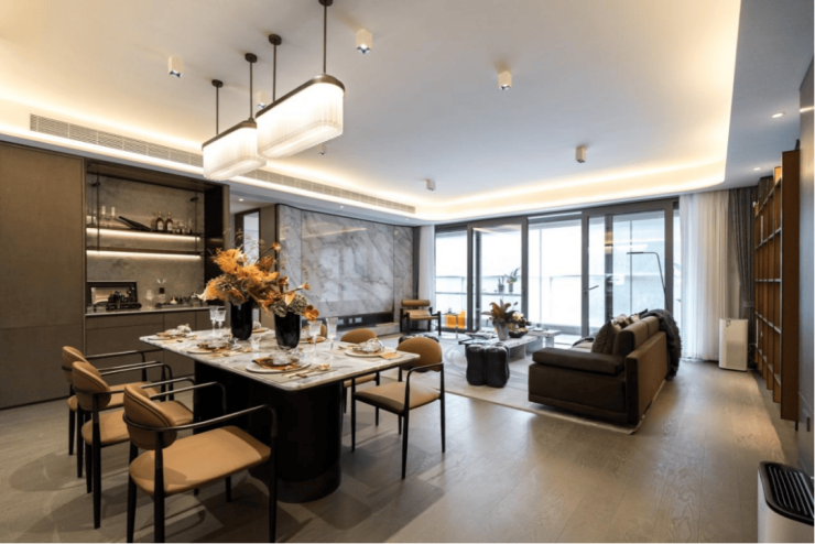 客餐厨一体化设计打破传统空间界限,约6.8米开间横厅可自由切换社交、亲子、宴饮等多元场景。