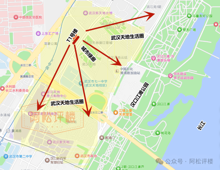 它的东南向即是延绵到汉口江滩的城市绿廊,西边即高低错落的社区中央园林,北向即市政公园(部分在建),毫不夸张的说,T1号楼东、西、北几乎被绿色环抱,在城市核心享真正的低密、松弛生活。