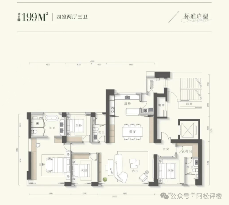 相较于T3号楼的建面约198平,T1号楼建面约199平又做了很多升级: