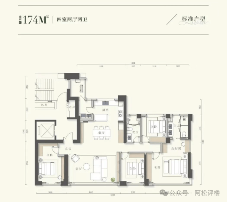 该户型南向约18.6米面宽,南向房间实现了“阳光平权”,主卧还是“L”型落地窗,采光、景观视野进一步升级;超大客餐厅动区空间+超34平的主卧套房+近20个平的次卧,奢阔感十足。