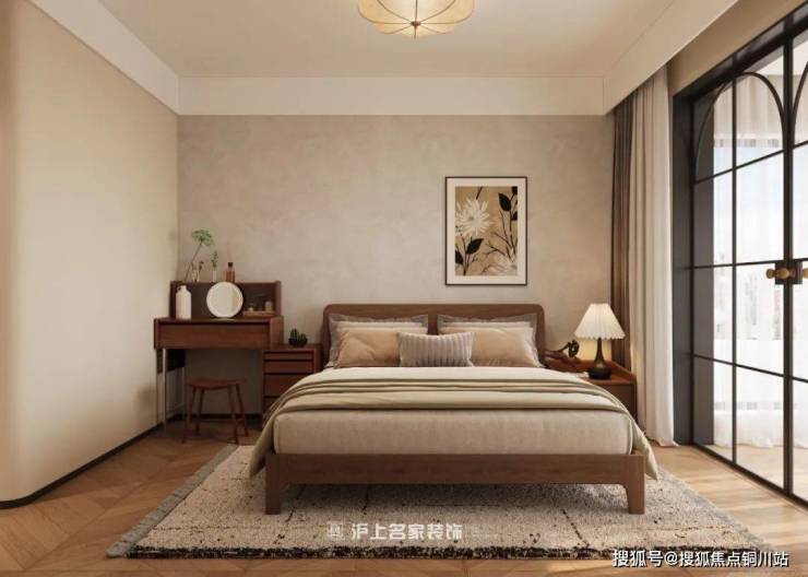 卧室以柔和的中性色调墙面搭配木质家具,营造出温馨而宁静的氛围。装饰画、编织毯叠加轻复古元素,让卧室成为褪去浮躁的治愈空间 。