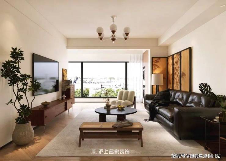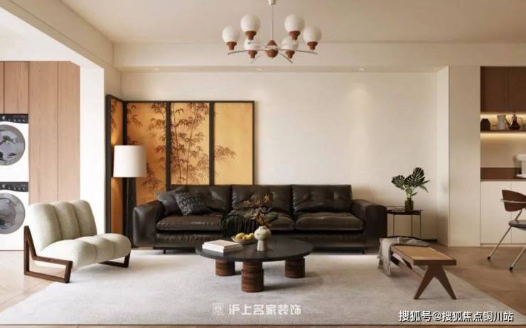 客厅的黑色皮质沙发自带岁月质感,木质家具与绿植点缀,平衡硬朗线条。竹影屏风融入东方意境,吊灯用圆润造型呼应复古,又借简洁线条适配现代审美。