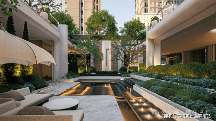 社区首层实现3.3-7米挑高架空,形成悬浮于园林之上的“空中花园平台”,并打造约200米全域风雨连廊,串联5座主题花园与7处景观节点。