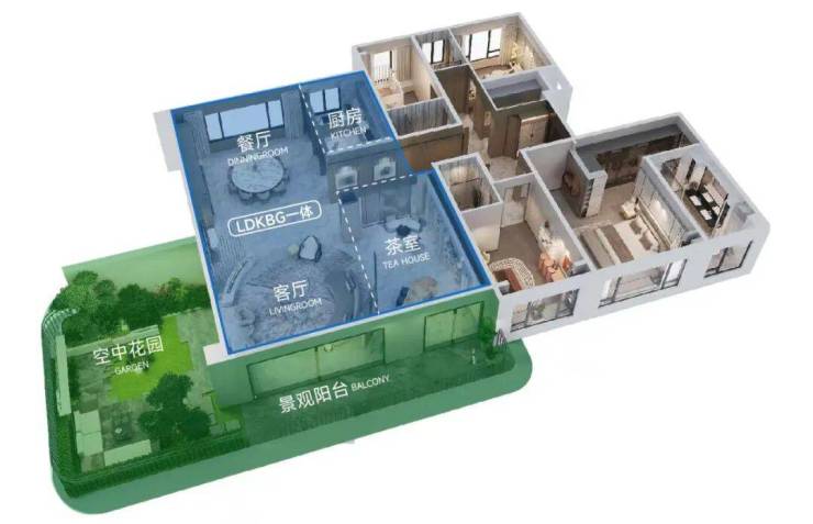 此外,项目将第四代立体生态住宅实现了居住品质的全面革新,空中花园+观景阳台的双向设计,丰盈了室内的观景面,室内外互动感也更强。