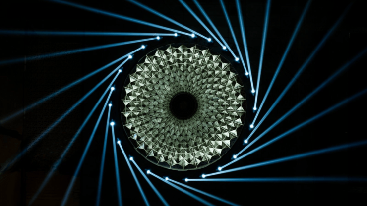 并将这种对先锋审美的极致追求,延续到了约42m宽、4.8m市政界面高度的仪式门厅,不仅首创了园区尺度之最,更由造价约200万的「栖心之巢」挺拔立起,师法“苏扇开阖”的非遗灵感,打造了全球首座金属苏扇艺术装置门庭,看到这样的大门,就能感受到一种「天下四聚」的强大气场。