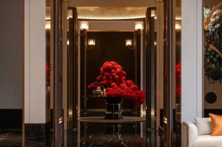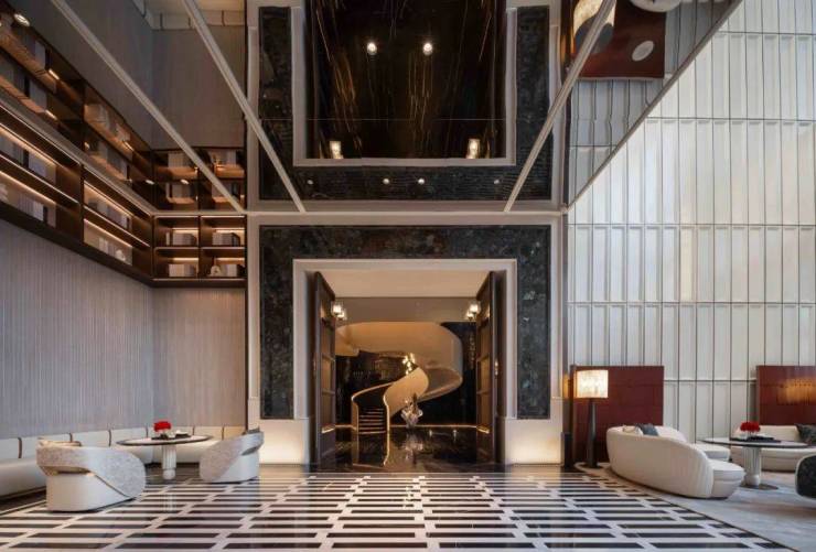 大堂以星级高奢酒店为蓝本,甄选全球奢材,蓝翡翠奢石优雅而奢华,劳伦黑金大理石神秘高贵。大堂采用世界上古老的水晶玻璃品牌Barovier&Toso凤羽水晶灯,像LV、宝格丽酒店、北京银泰中心卡地亚旗舰店都能看到Barovier&Toso的身影。