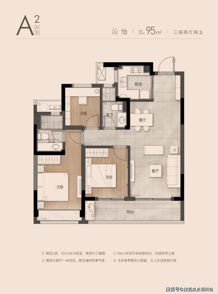 建面约95㎡三居室:舒适3房,格局方正通透;双开间观景阳台不仅延展了起居空间,更将清风阳光与园林景观引入室内;客餐厅一体化设计,打破了空间隔阂,无论是家庭聚餐还是亲友欢聚,皆能从容应对;主卧配备大飘窗,既可静享私密时光,又能俯瞰窗外景致,为生活增添一份诗意与惬意。