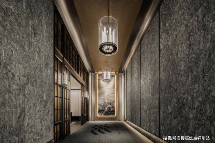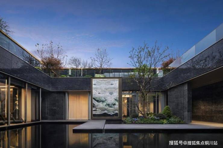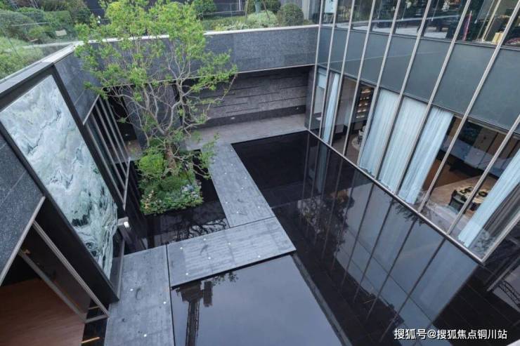 下沉庭院设计了⼤⾯积景观⽔⾯,寓意「引江⼊园」,并以纯粹⼲净的玻璃幕墙与爱尔兰绿奢⽯墙对景,营造出静谧、沉稳、祥和与空灵的氛围,希冀抚平闹市的喧嚣,实现「出则繁华、⼊则静谧」的生活场景。