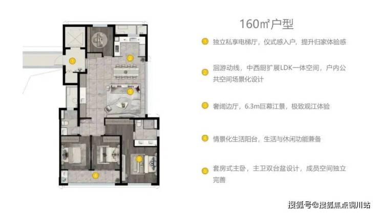 本项⽬楼王产品为198平⽶全景观江的端厅⼾型,通过南向阳台、东向飘窗的组合,使客餐厅区域获得了270°的全景观江视野。超大的玻璃窗分格设计,旨在使奉化江的美丽江景能尽收眼底。