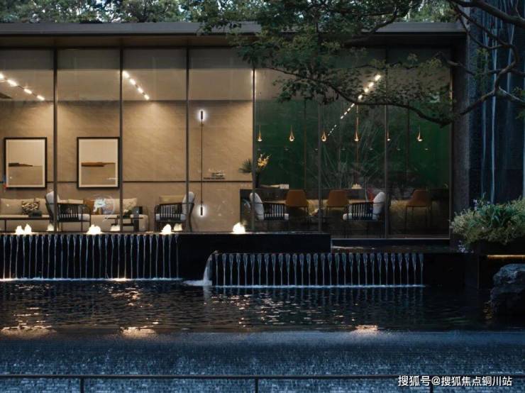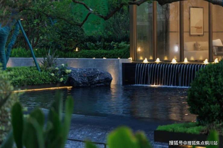 进入内庭空间,山涧流水跌瀑给予后场空间趣味与惬意。我们利用有限的场地,营造不同的高差变化,高耸的飞瀑流水,层层的清泉叠水,清脆悦耳。水景花池采用古铜色不锈钢边带,池底采用黑金沙黑花岗岩,且做了不同于前场水景的整黑系处理,整体形成几何肌理的视觉延伸。
