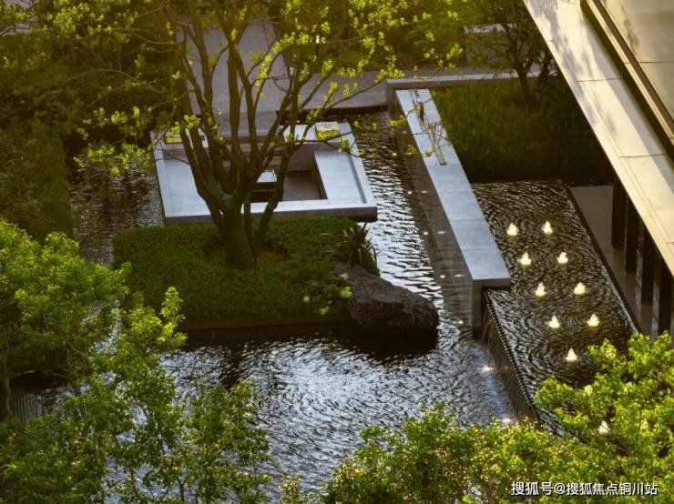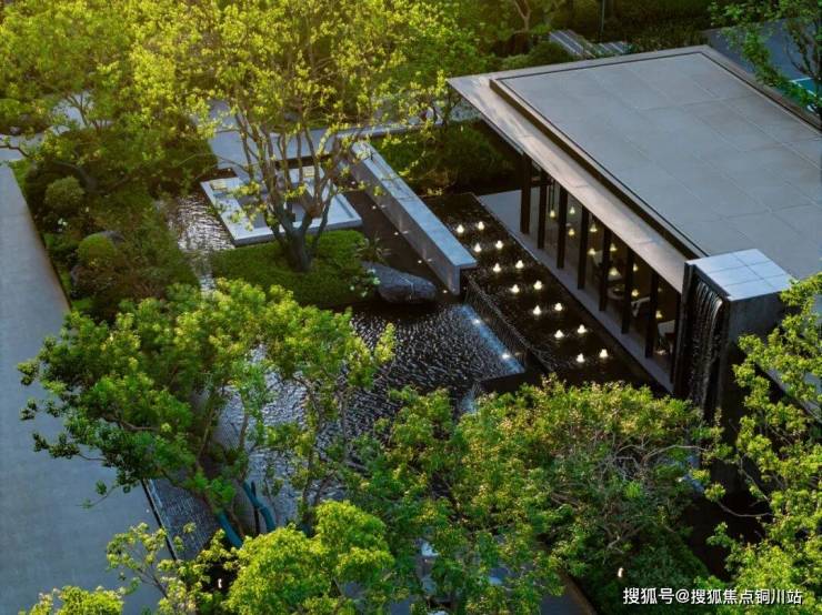设计充分利用场地周边积极因素,溯源无锡寄畅园。巧于因借,步移景异,置石理水、曲径通幽,融入“门庭、飞瀑、水涧、雅亭、繁花、静林、醒石、清泉”古典造园元素,结合现代人审美营造东方隐奢的气质,大雅至简的空间,洄游于半山半水之间,每走一步是不同风景,每看一眼都有不同的心境。