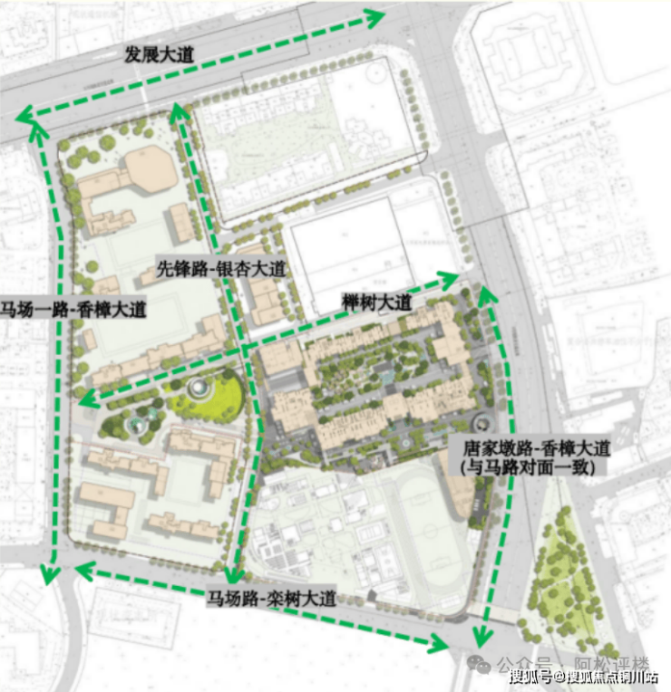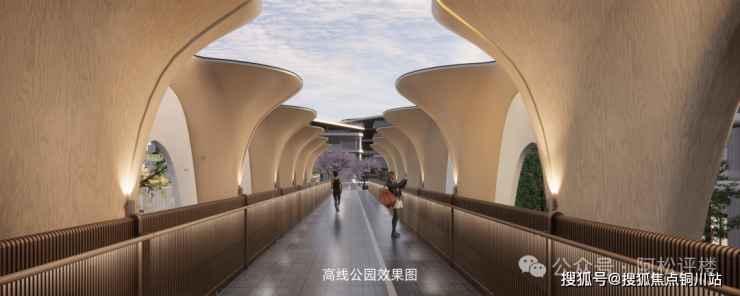 同时规划约300米的高线廊桥公园,不仅能直达会所、街区、体育中心等核心资源,从而融合小区内各功能空间、内外街道等。这个公园还能提升小区景观层次,廊桥上下也能成为不同的互动功能空间。