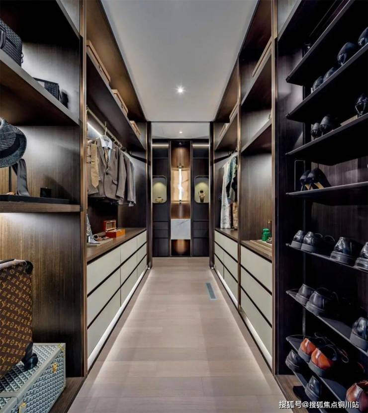 步入式衣帽间根据男女主人服饰习惯不同而划分为男士区和女士区。该衣帽间还预留有隐藏珠宝室,主人的高定首饰、名表、保险箱都可以放置于此。