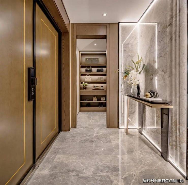 在入户玄关上,晋阳金茂府同样做了升级,打造独立礼序玄关,以“照壁+衣帽间”形式,铺贴名贵石材,营造双重私密和归家仪式感。