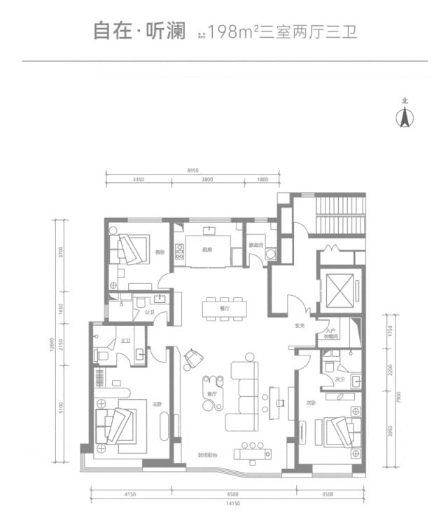项目所有户型皆以经典四叶草为基础,核心公区为LDKB一体化复合多功能超大宽厅, 最小户型建面约198㎡客厅开间约达6.5米,约320㎡客厅开间则约达8.65米,整个聚厅面积约115㎡,形成墅级活动场域。