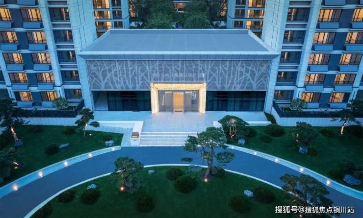 在归家大门上,项目打造了约72m港湾式落客区,搭配造型黑松主景,两侧的景墙材料选用酒店级天然大理石静雅白,开启了酒店式归家之路。