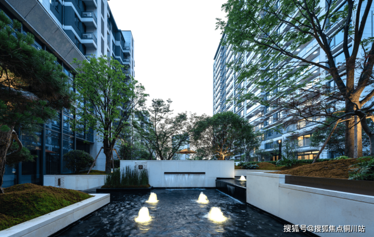 穿过社区大堂,映入眼帘的是寓意着步步高升的层级叠水,项目采用堆坡造林的自然式手法,点缀大面积的苔藓结合潺潺流水,打造一种自然山林归家的感受。