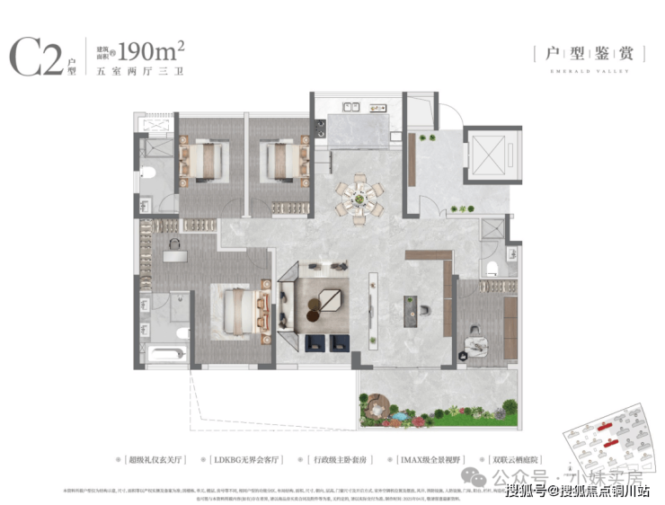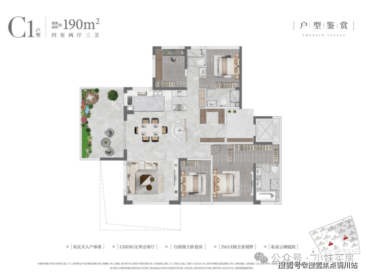 客厅采用270度全景舱设计,加上餐厅、外连的空中花园,大平层的体验感更强;整个南向开间约18.6米,绝对尺度可以,不过在其他四代项目170多平户型也能拥有差不多尺度的南向开间,另外,与驿山高尔夫187平的观景户型对比,深业190平户型的观景面要小得多。