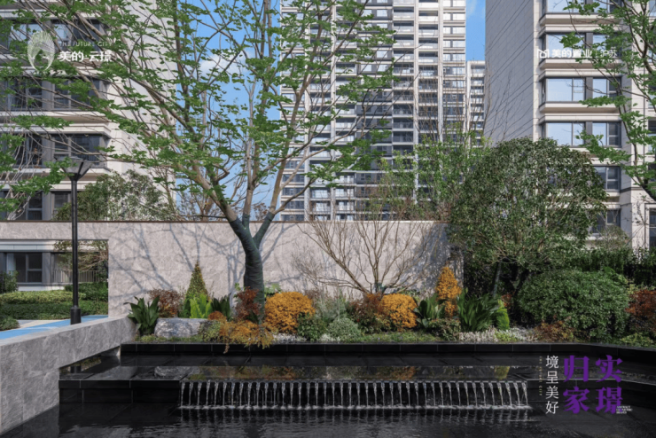 单元门口,宅前屋后,繁花雅院精心打造,为业主们提供了一处私密而温馨的绿色空间。花园内种植着各种花卉和灌木,四季有花,季季不同景。绿化植物高低错落有致,最有辨识度的乌桕、香樟、丛生朴树自成风景,归家的途中,镜面光影中的乌桕、香樟与水中倒影相映成趣,移步异景。