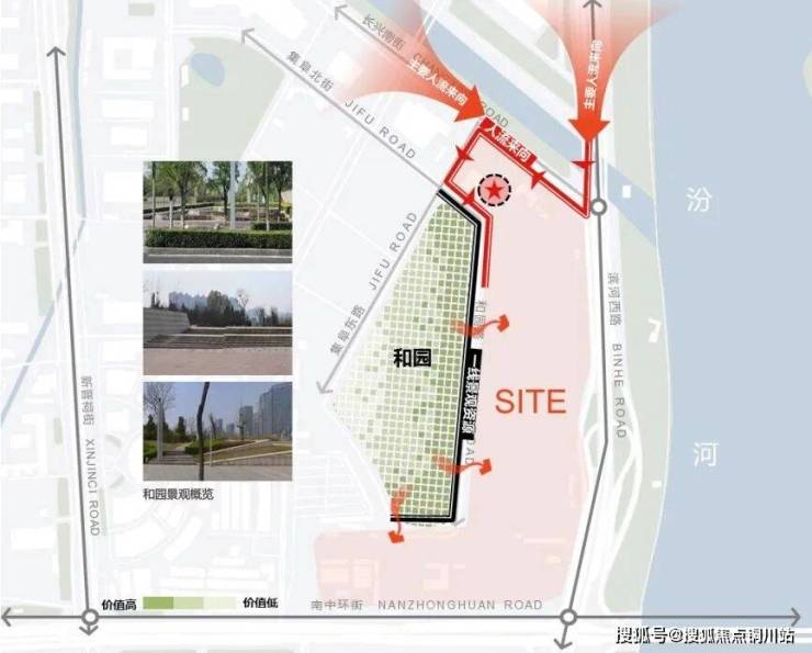 因北侧为主要人流来向,且拥有一线景观资源,故而将示范区的选址设置在西北角,可远眺汾河景观,亦可对仗和园美景。