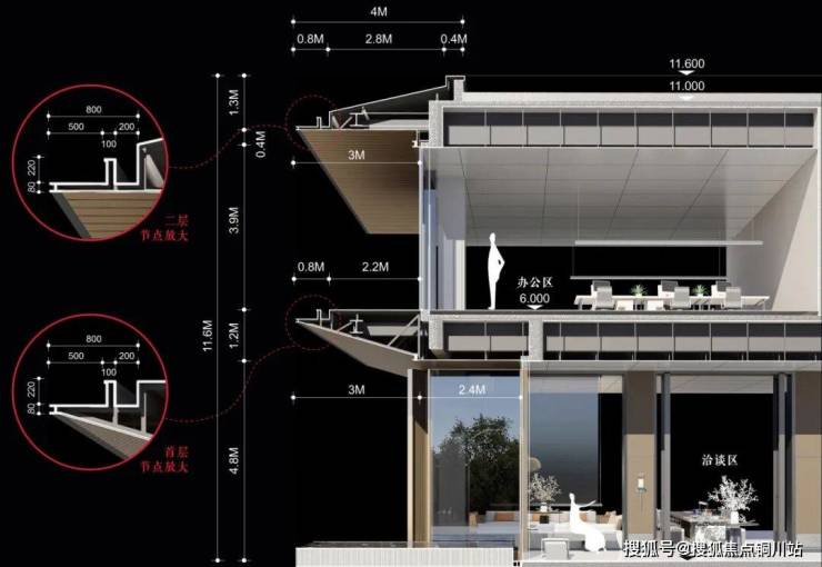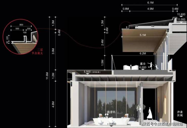 雨棚是连接照壁和大门的过渡空间,它的顶部被设计成与照壁上的山水图案相呼应的形状。这些图案通过连续和重复的设计手法,一直延伸到雨棚的顶部,形成了接天莲叶无穷尽的感觉,不仅增加了整个大门的立体感和层次感,同时也使整个示范区更加具有艺术性和观赏性。