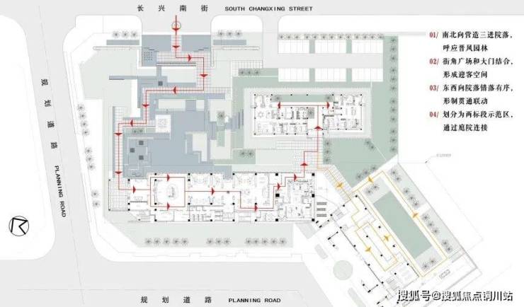 内部规划结构采用山西传统的园林建筑风格,南北向营造三进院落,体现晋风园林特色。从入口处的街角广场和大门开始,形成了一个宽敞明亮的迎客空间。同时东西向院落错落有序,形制贯通联动。