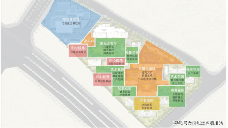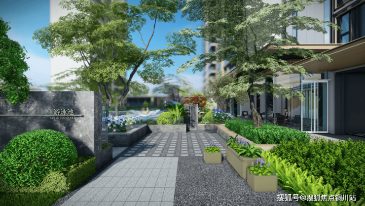 归家小院:利用消 防尽 端道路设置泳池等候休憩花园,满足家长等候的需求,也能为泳池提供后续放置水壶、毛巾等临时 需求的空间。