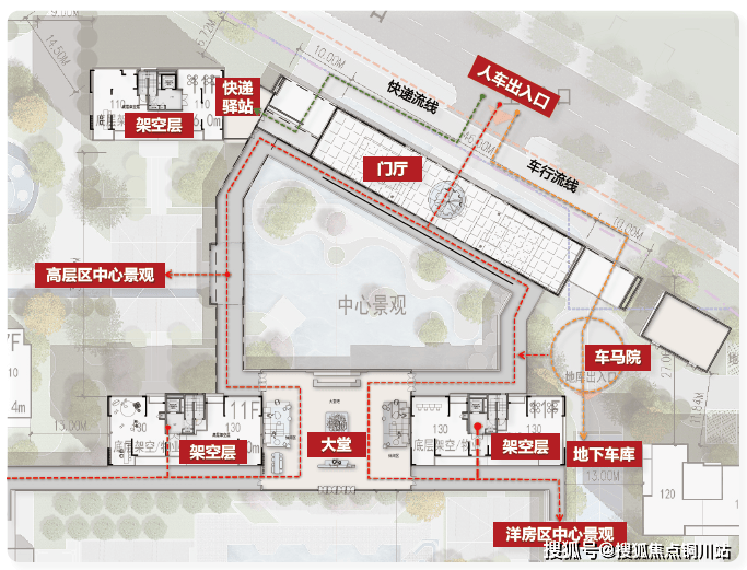 主入口:结合60米礼仪广场,三进式布局,一进酒店式大堂,摩登典雅;二进迎宾回廊,静水微澜;三进中心 泳池,碧海晴天。层层递进,打造沉浸式归家体验,登高场地联动宅前小径设计,梳理归家动线。地下室一层主车道串联坡道,以环路串联次车道,明晰高效。