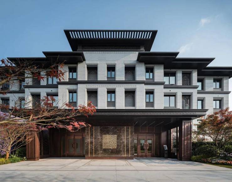 项目在建筑立面上,保持与景观风格统一,汲取古法以三段式重构建筑的东方典雅审美,整体色调沿用金陵灰墙黛檐的传统色系,以大气典雅的灰色为主基调,立面采取大面积干挂天然石材、玻璃幕墙,搭配深色铝板。