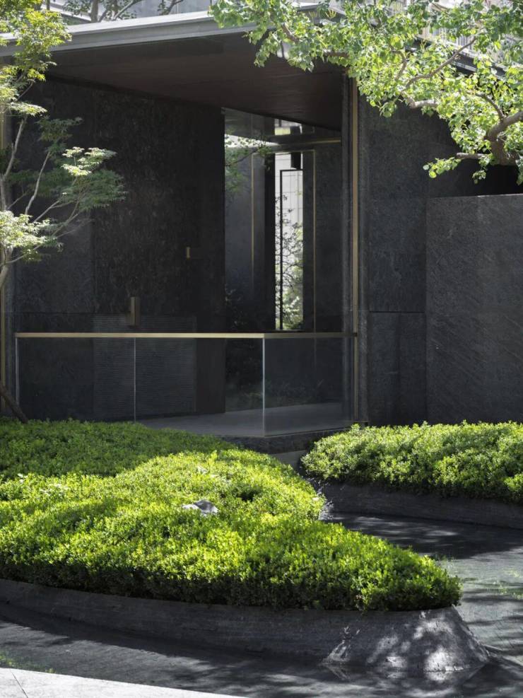 后场核心庭院:以“悬浮之境,自然诗学”为理念,于中庭水林苑之上构筑一方抬高的茶室。其构筑体量以轻盈之姿悬浮,与景墙形成浑然一体的雕塑感,塑造出奢雅、有序且极具艺术感的静谧空间。林居、镜池、水苑在此自然交融,生活被彻底浸润于风景之中。