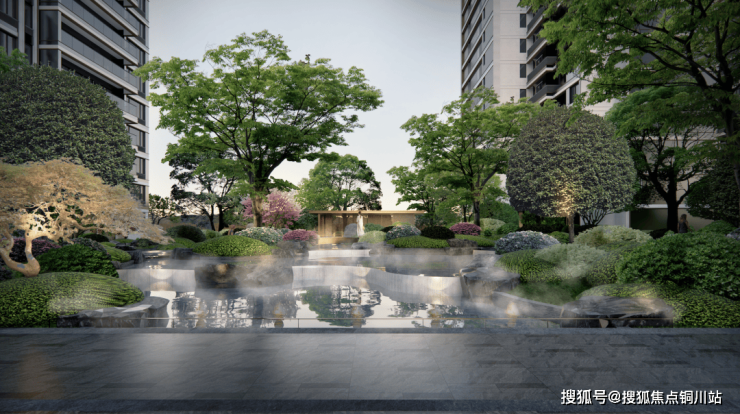 未来人居的核心,是人与自然的和谐共生。 荷语江山府 西区 跳出传统园 林的造景逻辑,以千年宋韵为基底,深度融合《千里江山图》的艺术灵感,打造 “望樾九境”雅奢园林,将山水之趣、人文之韵藏于一园之中。