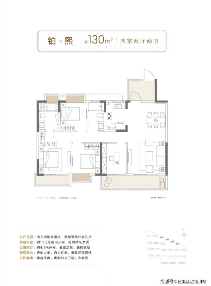 建面约130㎡四房两厅两卫:四面宽的诗意生活,只有懂生活的人才知道!约13.2米大尺度南向四开间,约4.1米巨幕客厅,主卧配置270°观景飘窗,大大提升居住舒适度,改善属性浓厚。