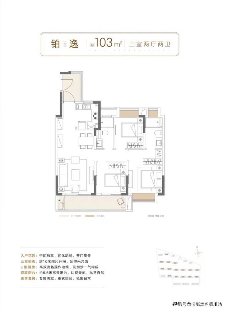 建面约103㎡三房两厅两卫:客餐一体化设计,南北通透,约10米大尺度南向开间,约6.6米南向双阳台,南向主卧套房,静享私密。