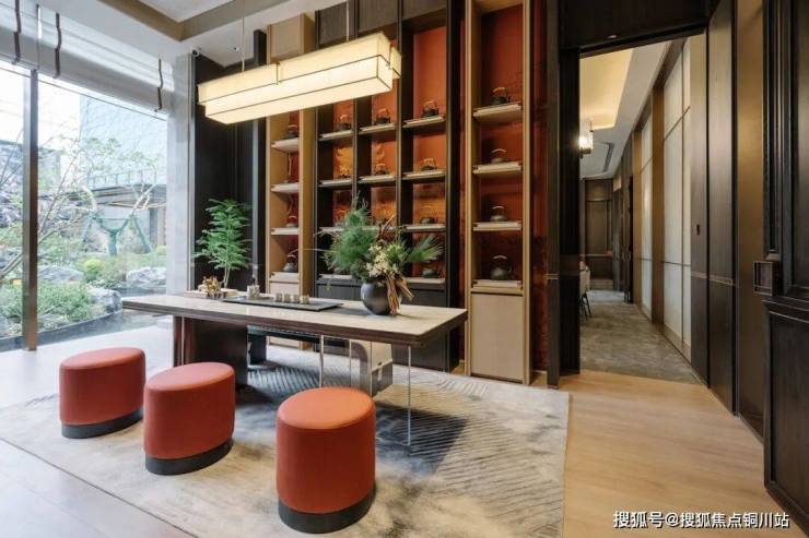北京中建壹品颐和公馆,把颐和园的皇家园林与唐风融入项目。占地约5000平米的颐和典藏馆,以门钉、藻井、天花等大门立面的细节,又与颐和风韵相结合,再现皇家造园之美。